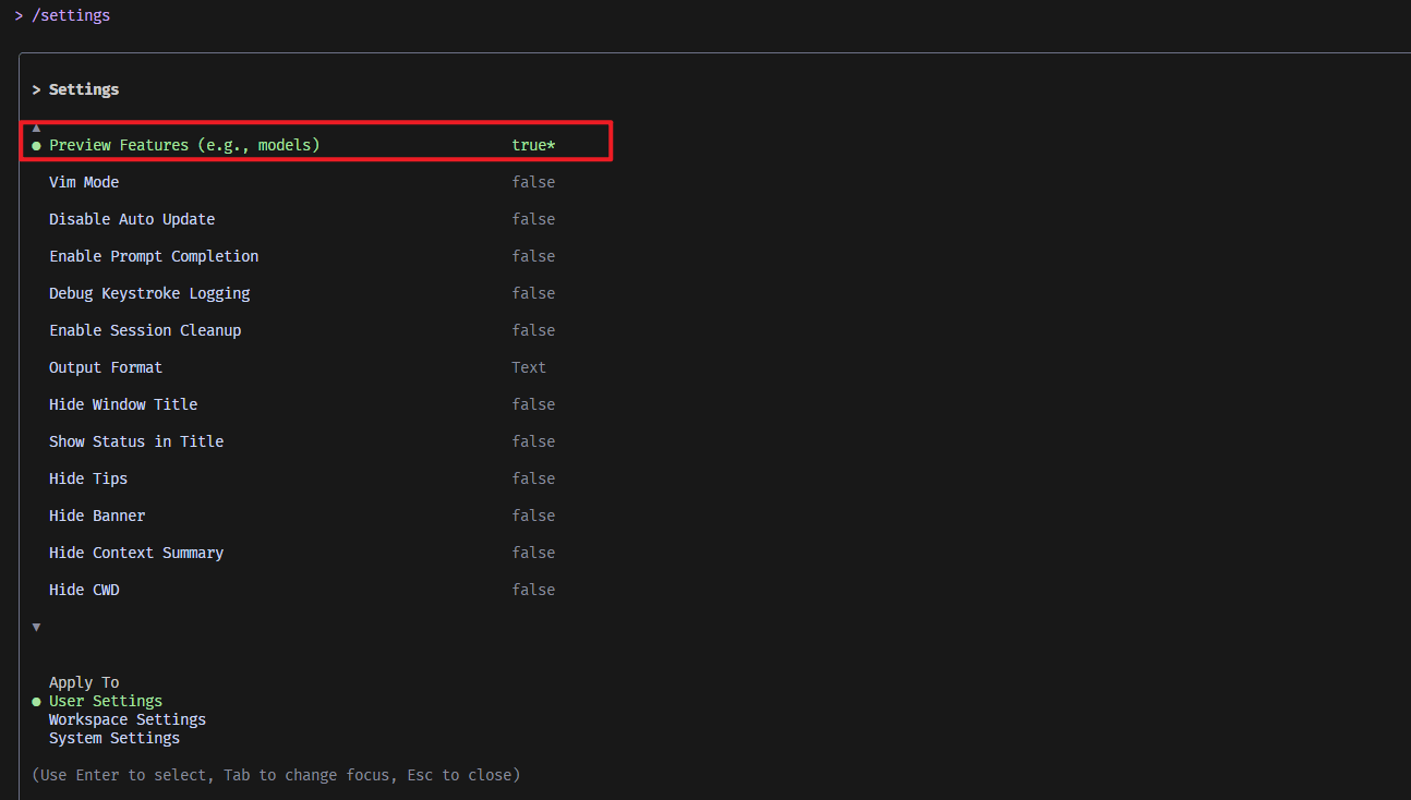我先使用/settings打开设置这时候就会看到第一个选项:启用预览。我们按一下空格即可开启/关闭。然后按ESC就可以退出设置。