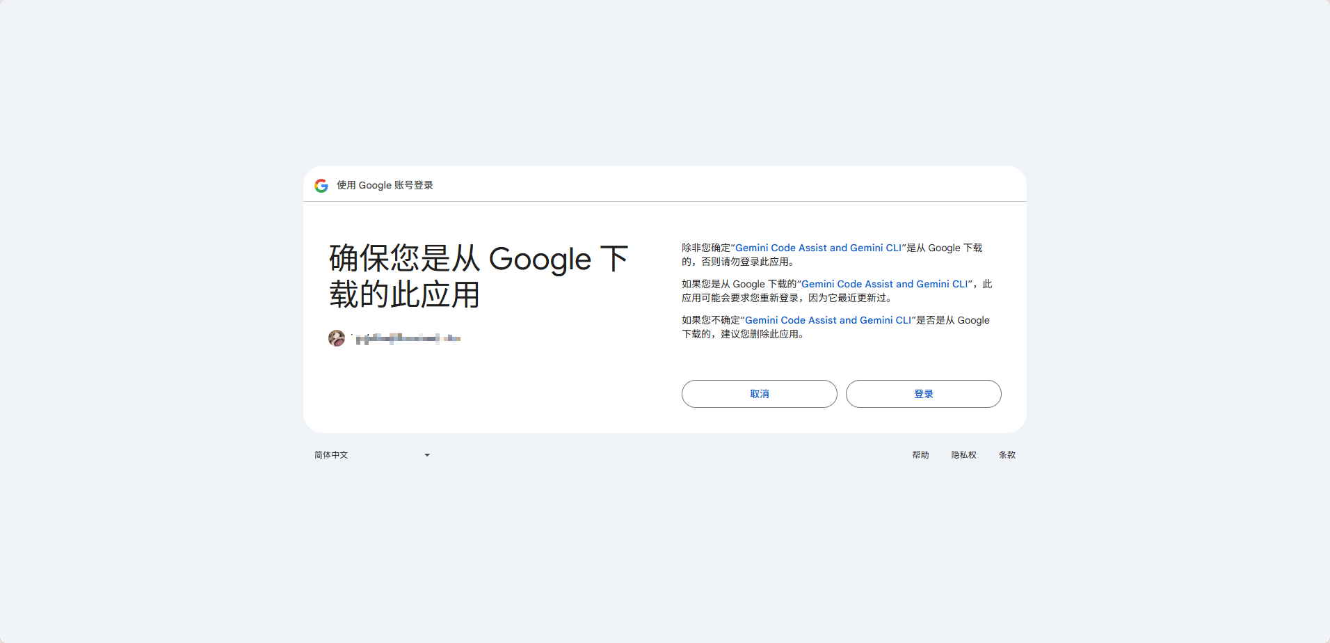 npm install -g @google/gemini-cli安装完成之后我们可以使用gemini -v查看是否安装完成,只要返回了版本信息就是没有问题的。