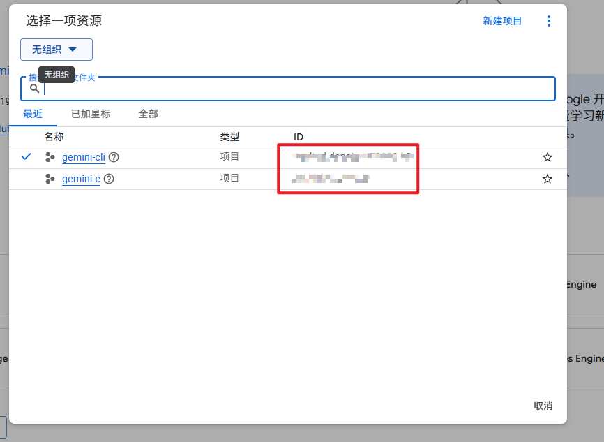 配置完成之后我们打开:https://console.cloud.google.com/ 可以在点击左上角的项目选择器查看我们的项目id