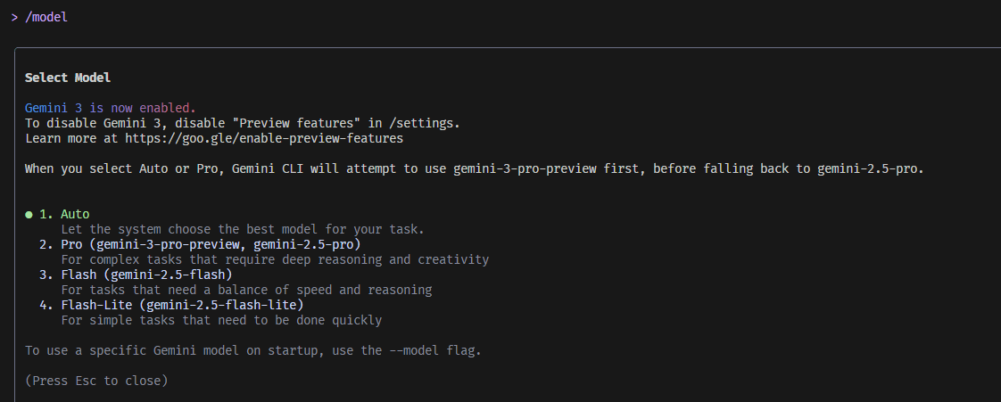 首先我们输入/model就可以切换模,这时候我们看到我们的模型是没有Gemini 3的,是因为我们没有开启使用。