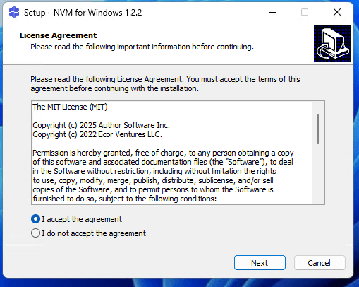下载后双击运行 nvm-setup.exe。如果你不想安装在默认路径(C盘),记得在安装过程中修改路径,之后一路点击“Next”无脑下一步即可。