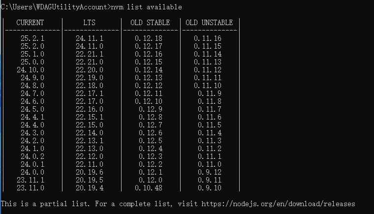 nvm list available这个命令会列出当前官方所有的 Node 版本,包括 LTS(长期支持版)和 Current(最新版):